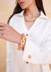Maniche: lunghe con polsi doppi e abbottonatura con gemelli gioiello Bottoni: realizzati artigianalmente in bronzo con dettaglio monogram “MB”